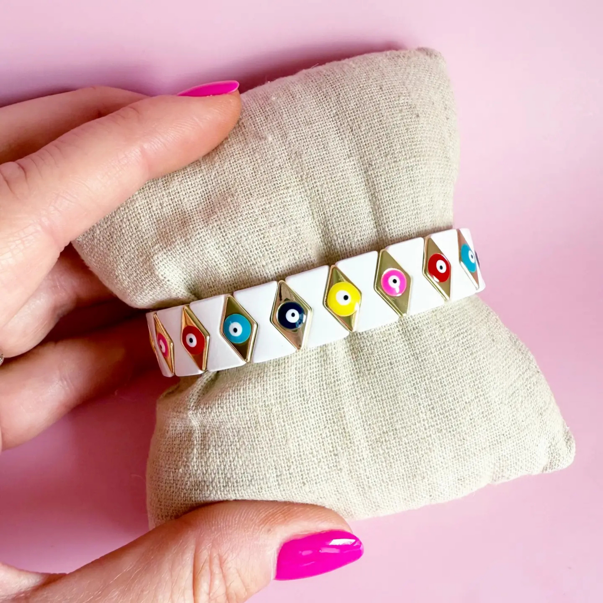 White and gold bracelet with multicolored accents. The perfect bracelet to add to any stack!